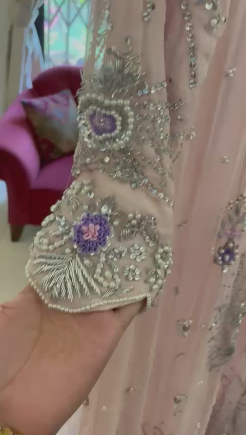 Soft, dreamy, and dripping in elegance, this pastel pink flared frock is everything a guest wedding outfit should be. Featuring intricate dabka work, delicate resham detailing, and hand- embellished pearls, it's a true masterpiece of craftsmanship. The flowing silhouette and subtle shimmer make it perfect for daytime weddings, receptions, or intimate festive soirées. Because nothing says grace like pastel perfection.