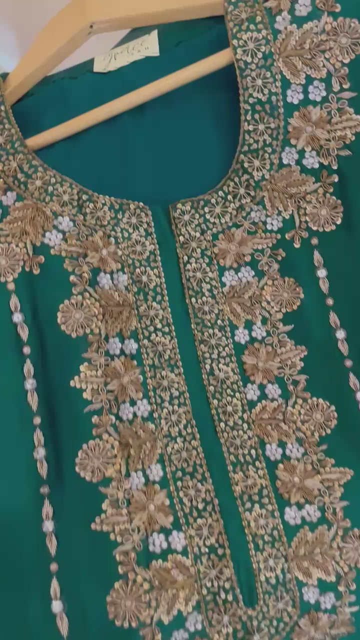 Regal in every detail, this emerald green long shirt stuns with rich double dabka kaam and an opulent broad daman. A masterpiece of traditional craftsmanship, designed for grand wedding moments where every thread speaks of timeless grace.